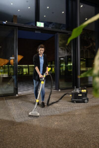 Das limitiert verfügbare schwarze Sprühextraktionsgerät Puzzi 8/1 Go!Further aus 44 Prozent recyceltem Kunststoff¹⁾ ist mit exklusivem Zubehör und einer 1-Liter-Flasche des Reinigungsmittels RM 764N OA ausgestattet. Dank seiner hervorragenden Rücksaugleistung ermöglicht der professionelle Waschsauger sehr gute und hygienische Reinigungsergebnisse sowie eine schnelle Wiederbegehbarkeit von textilen Flächen. Dazu sprüht das Sprühextraktionsgerät die Reinigungslösung tief in die Textilfasern ein, saugt diese anschließend inklusive des gelösten Schmutzes wieder ab und eignet sich so perfekt zur Reinigung von Polstern, Teppichböden und anderen textilen Oberflächen. Seine robuste, kompakte Bauweise sorgt für eine lange Lebensdauer und damit eine hohe Wirtschaftlichkeit – ideal für Gebäudereiniger, im Hotel- und Gaststättengewerbe oder bei der Fahrzeuginnenreinigung. Zur besseren Sicht auf die Schmutzflotte sind der Gerätedeckel sowie die Polster- und die Bodendüse transparent gehalten. Ein Sichtfenster am Griff erhöht die Kontrollmöglichkeiten dabei zusätzlich. Das geringe Gewicht des Puzzi 8/1 Go!Further und ein ergonomischer Tragegriff ermöglichen einen einhändigen Transport.