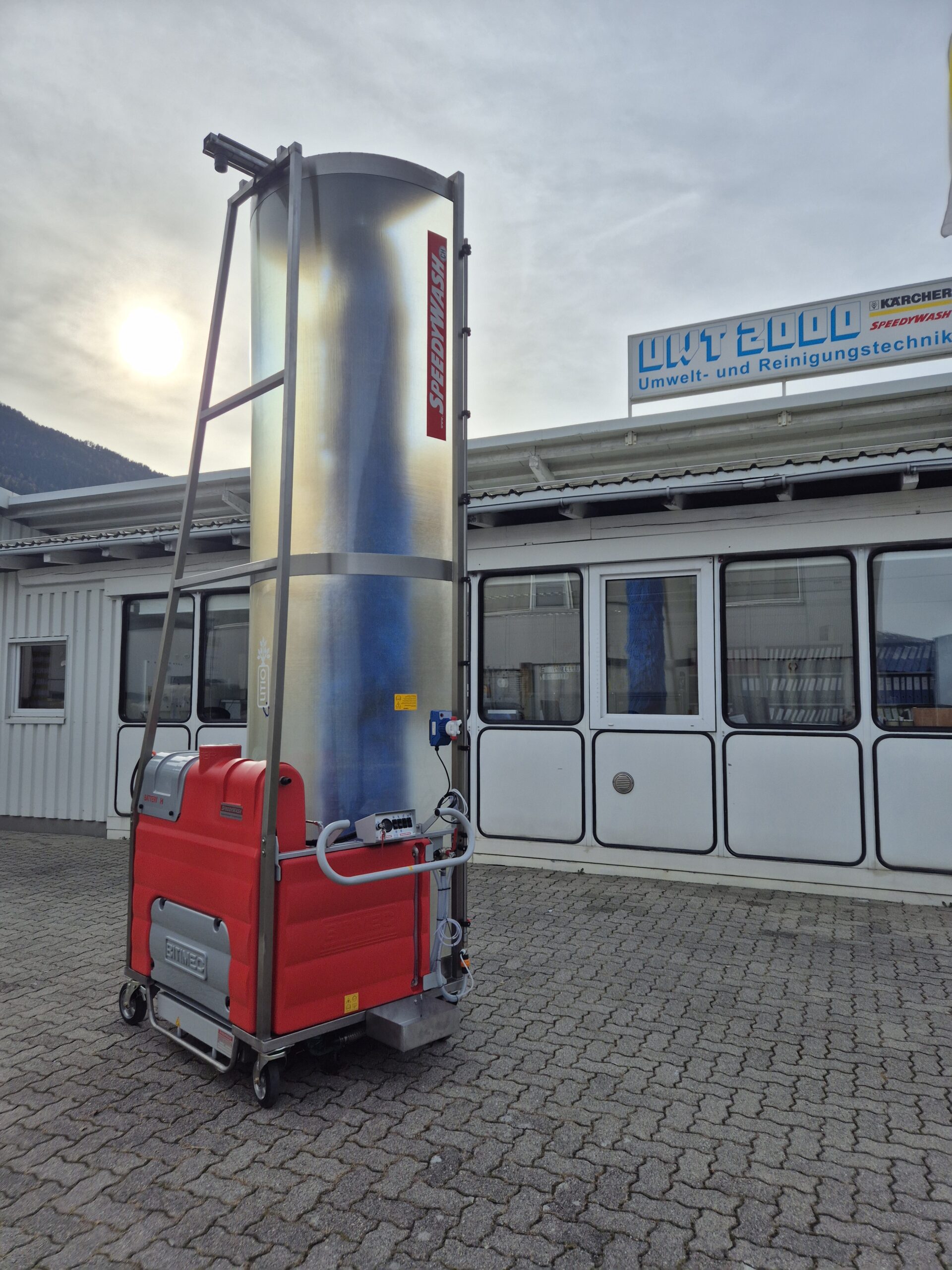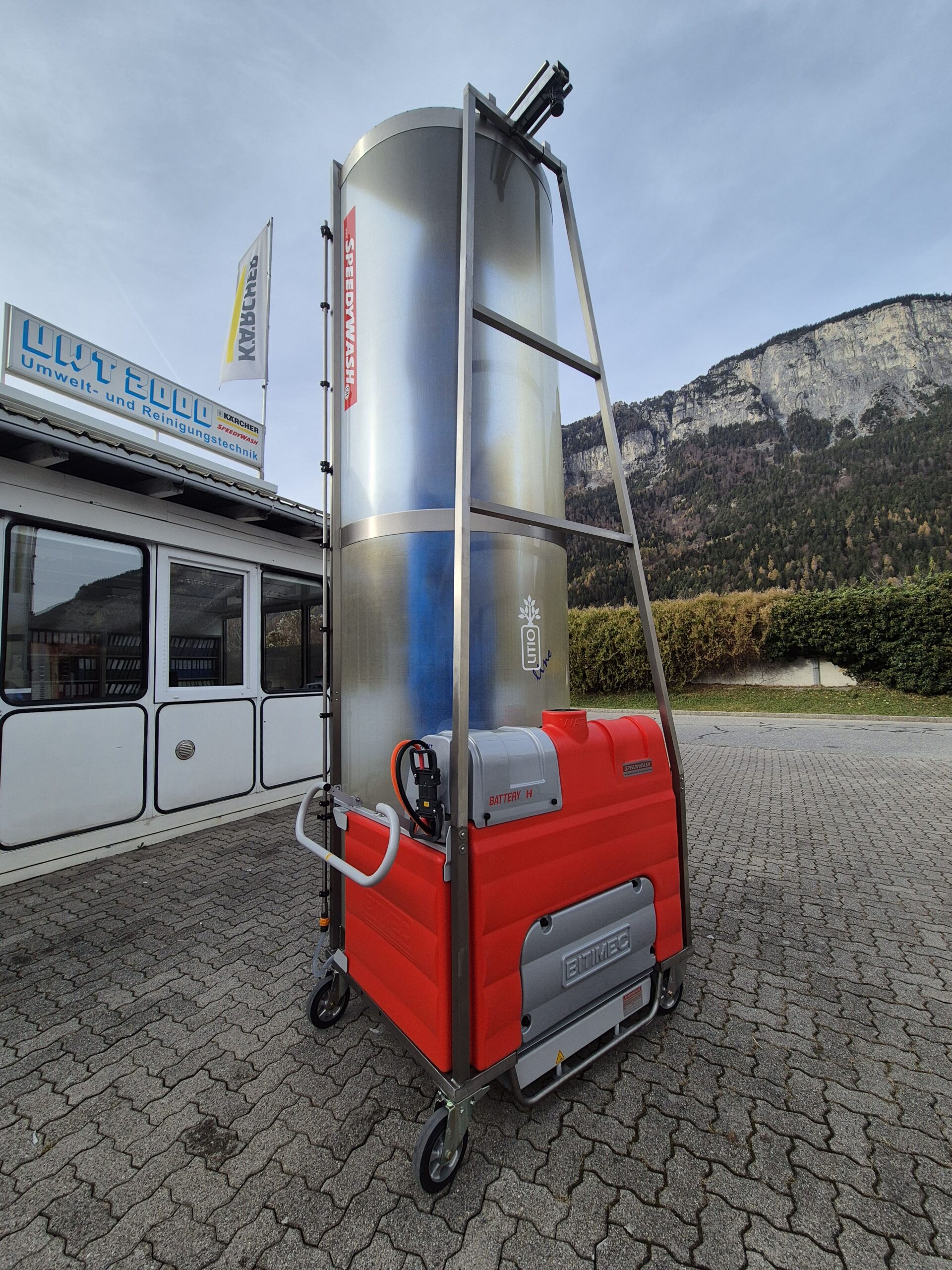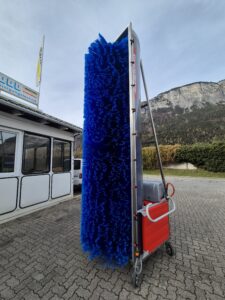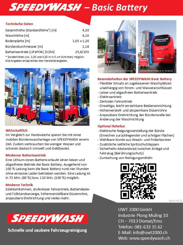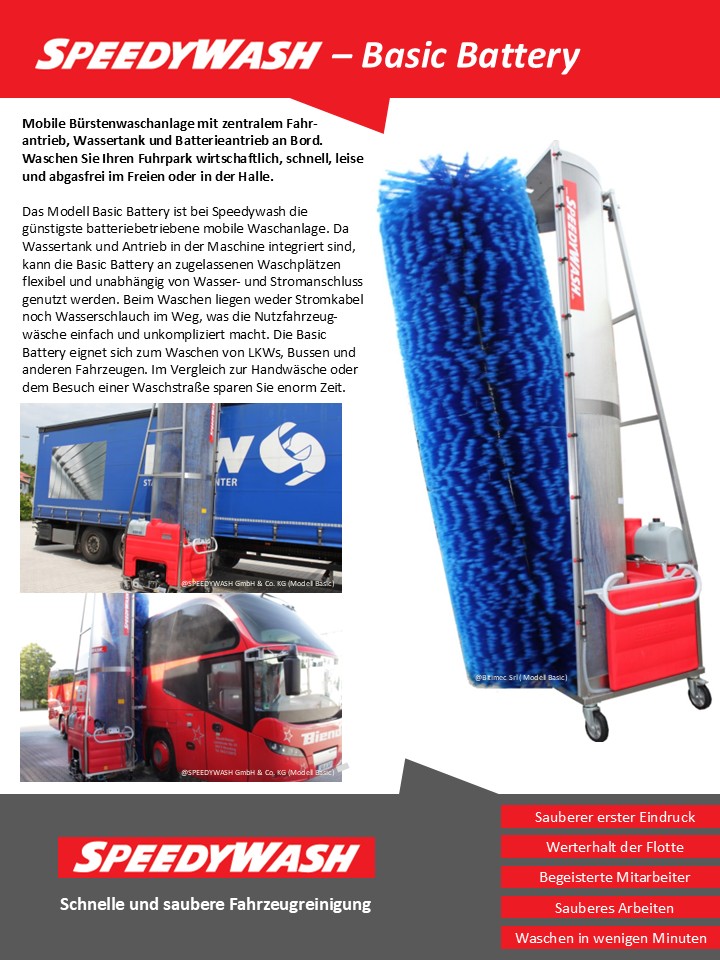 Das Modell BASIC Battery, mit Lithium- Akku von SPEEDYWASH ist eine mobile Bürstenwaschanlage mit zentralem Fahrantrieb, Wassertank und Batterieantrieb an Bord. Durch den abgasfreien und leisen Betrieb kann die Anlage zum Waschen von LKWs, Trucks, Transportern, Bussen und anderen Nutzfahrzeugen in Hallen, im Freien und Gebieten mit Lärmschutzauflagen eingesetzt werden. Dank des integrierten Tanks und Antriebs ist an zugelassenen Waschplätzen ein von Strom- und Wasseranschlüssen unabhängiger Einsatz möglich.